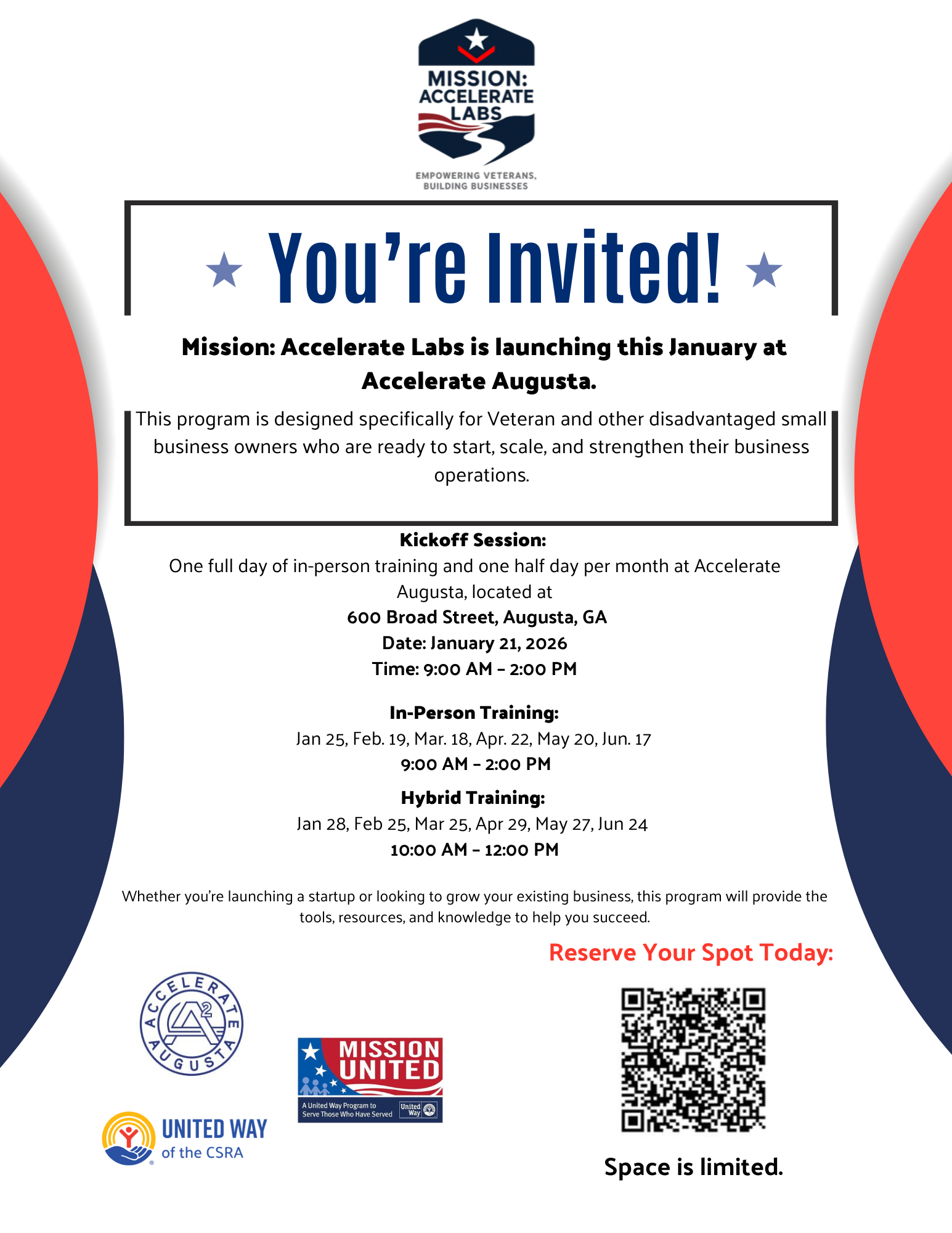 Participants will work through key areas of business success, including business validation, financial readiness, leadership transition, and growth strategy. Whether you’re exploring entrepreneurship for the first time or refining an existing venture, Mission: Accelerate Labs equips you with clear next steps, confidence, and a network that lasts beyond the program.